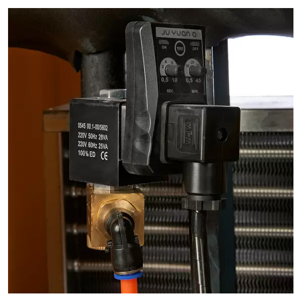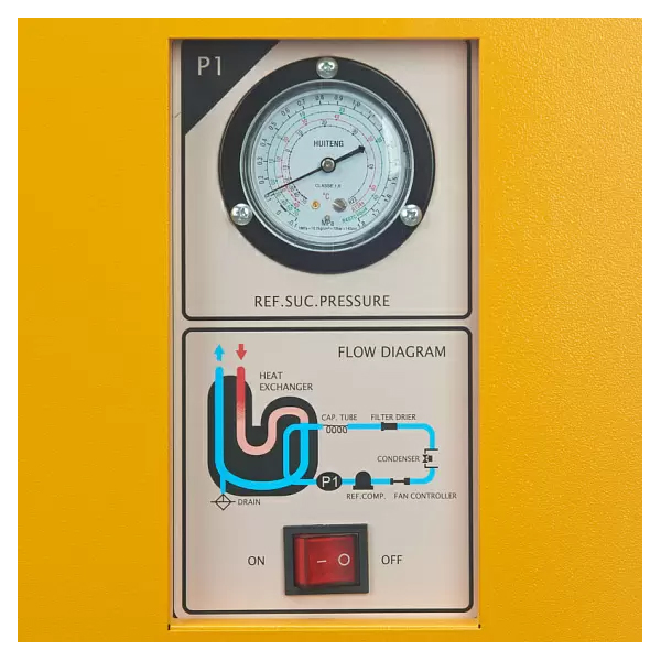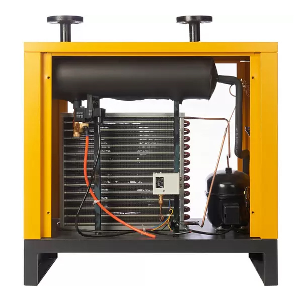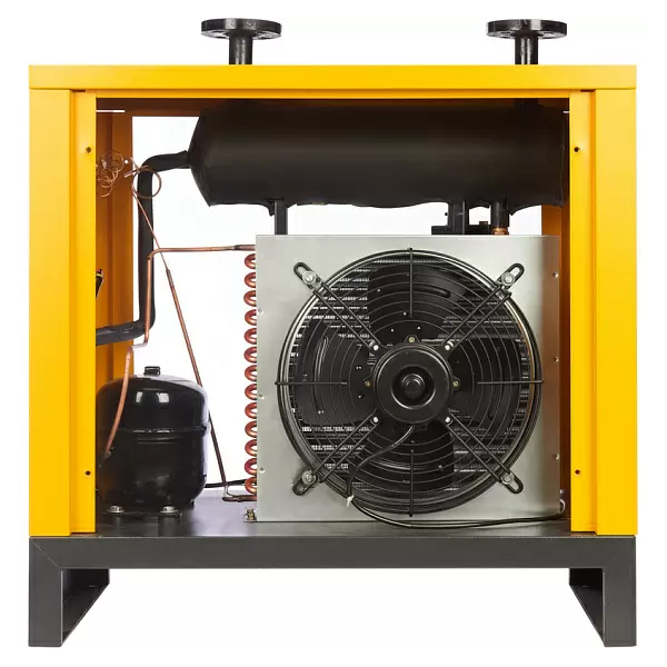 Сжатый воздух, поступающий от компрессора, охлаждается до температуры точки росы в две стадии. На первой стадии теплообменник воздух-воздух охлаждает нагретый сжатый воздух при помощи холодного воздуха, поступающего из отделителя конденсата. На второй стадии теплообменник фреон-воздух понижает температуру сжатого воздуха до заранее заданной температуры точки росы (+3°C).