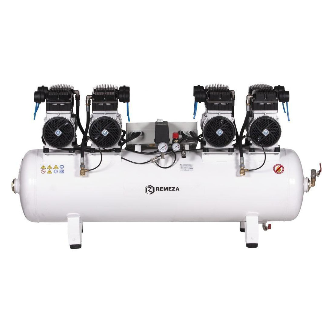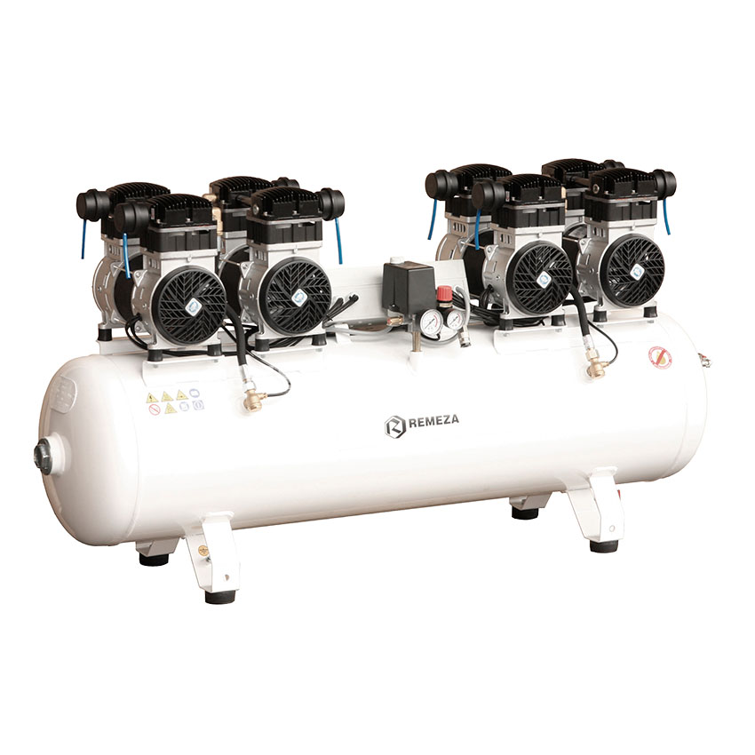Безмасляный компрессор с четырьмя двухцилиндровыми одноступенчатыми поршневыми блоками на воздушном ресивере 150 литров производительностью 1000 л/мин при давлении 8 бар.