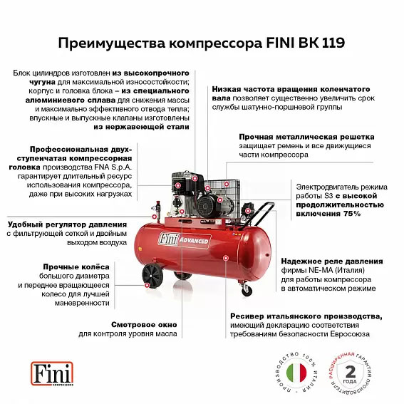 Серия FINI BK Напряжение/частота тока/фазы, В / Гц / кол-во фаз 400/50/3 Уровень звукового давления (LpA), дБ(А) 80 Габаритные размеры (Д х Ш х В), мм 1550 x 590 x 1130 Ёмкость ресивера, л 270 Поршневой блок BK 119 Транспортировочные колёса Да Цилиндры/ступени 2/2 Производительность (всасываемый воздух), л/мин 840 Макс. рабочее давление, бар 10 Потребляемая мощность, кВт 5,5 Присоединительный размер крана, дюйм Рапид (EURO) Вес нетто, кг 147 Страна регистрации бренда ИТАЛИЯ Страна производства ИТАЛИЯ Тип двигателя Электрический -