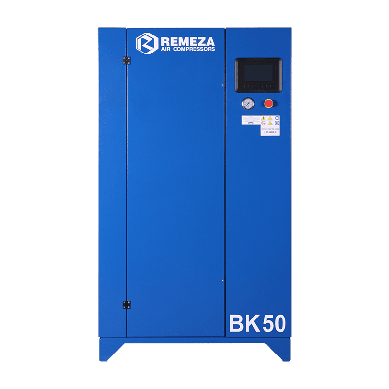 Винтовой маслозаполненный компрессор с воздушным охлаждением REMEZA BK50-10: производительность 5200 л/мин, макс. давление 10 бар, мощность 37 кВт.